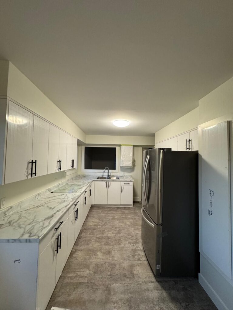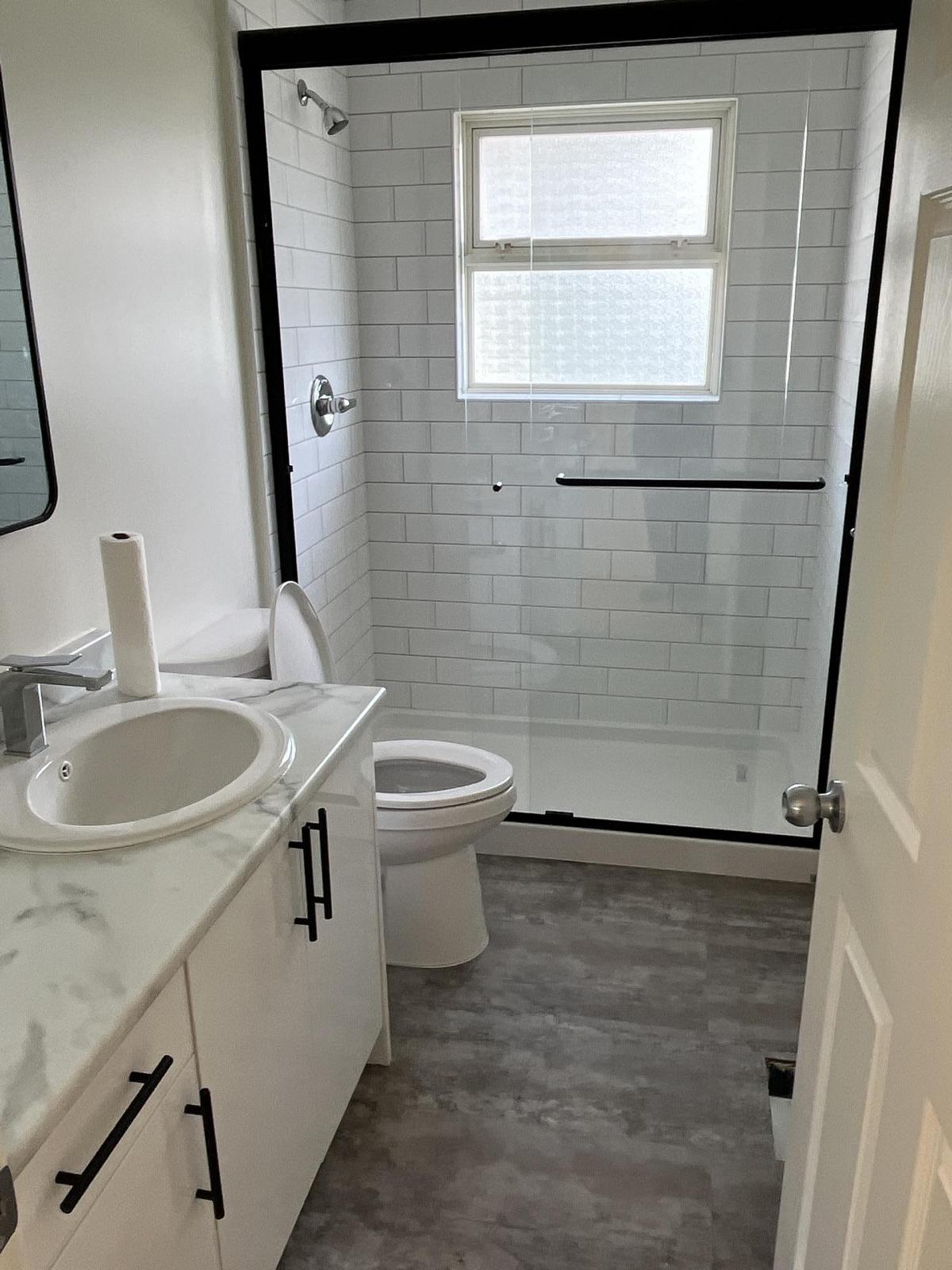 The kitchen and bathroom were fitted with custom-built cabinets and elegant marble-finish countertops, blending functionality with timeless design. - Complete Bathroom Renovation